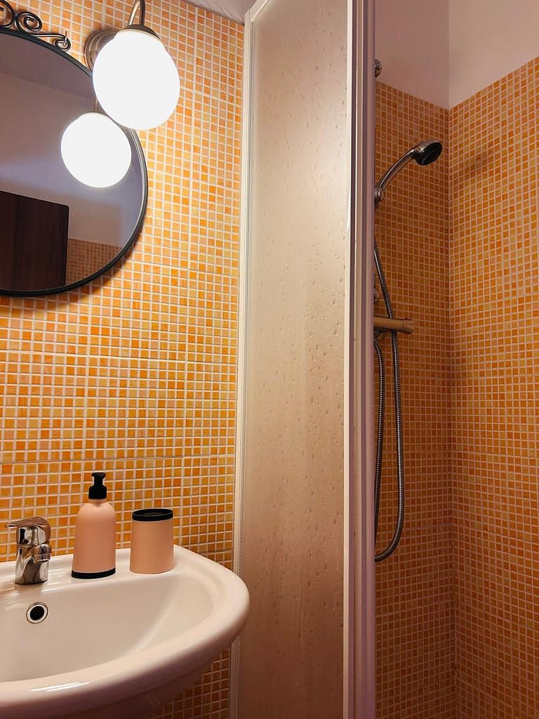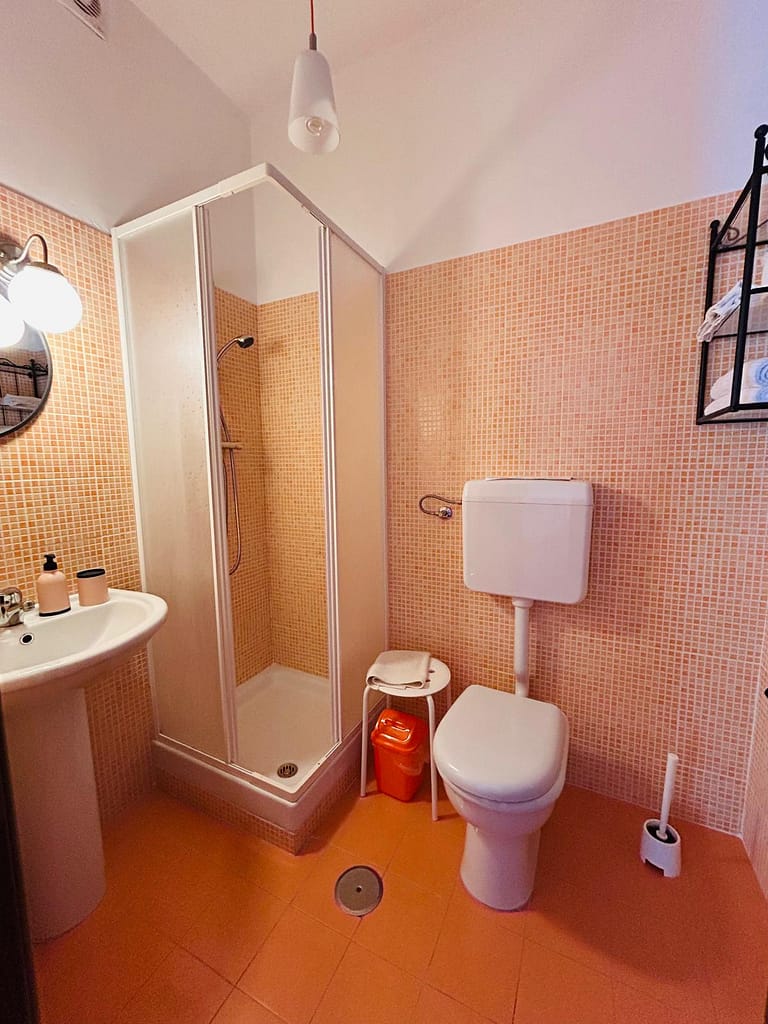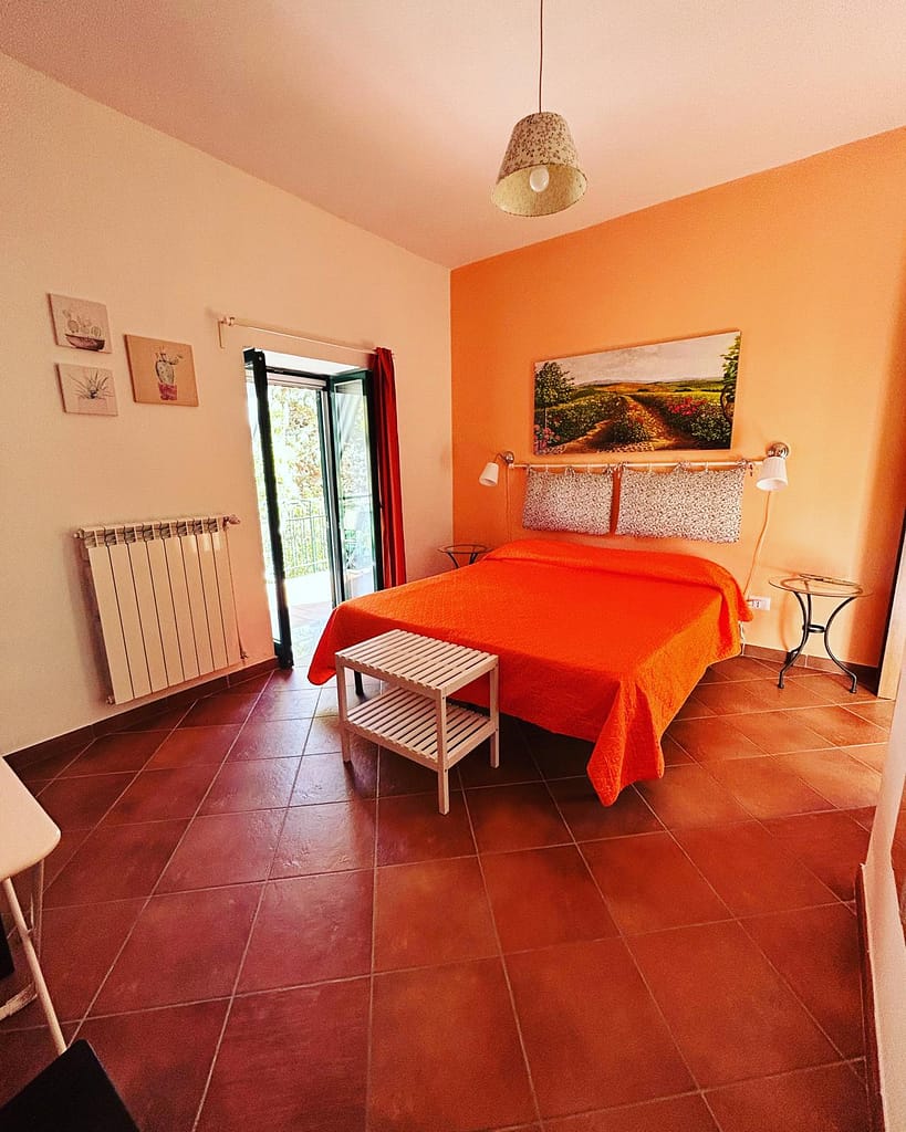 La camera arancione è una camera matrimoniale il bagno è in camera ed a uso esclusivo (senza bidet).