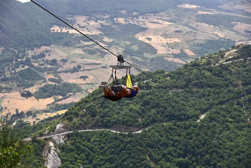 Legati con tutta sicurezza da un’apposita imbracatura e agganciati ad un cavo d’acciaio il visitatore potrà provare per quale minuto l’ebrezza del volo e si lascerà scivolare in una fantastica avventura, unica in Italia ma anche nel Mondo per la bellezza del paesaggio e per l’altezza massima di sorvolo.